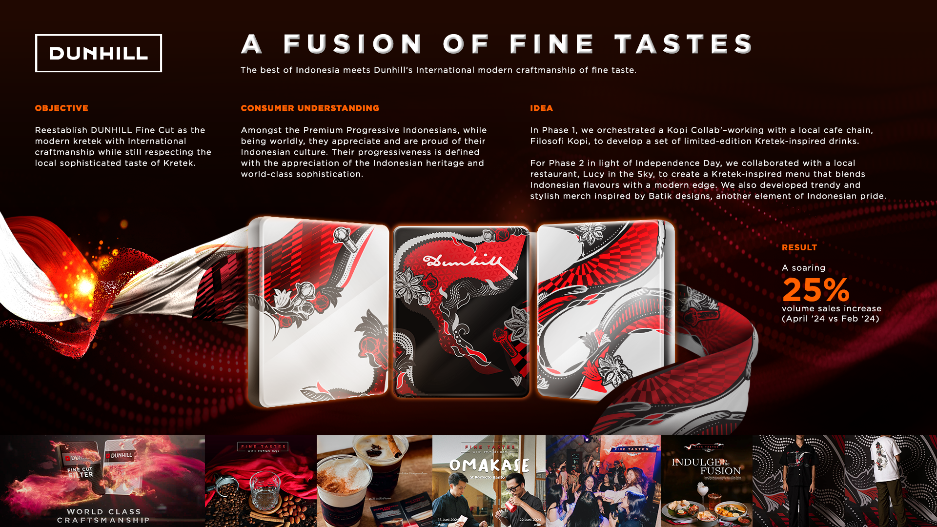 Worked on the Dunhill Kretek Indonesia campaign on both strategy and creative concept to bring the brand’s modern sense of premiumness to life. From uncovering cultural cues to shaping the visual and narrative direction, the campaign redefined what sophistication means in the local context and went on to become a Dragon Awards finalist.